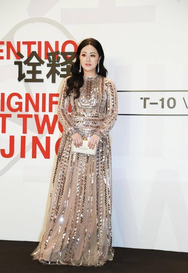 章小蕙向来不是低调之人,即便选择了低调的香槟色礼服裙,也会借助亮钻满铺让自己更加光彩夺目。这条礼服裙身铺满了香槟色系亮钻,但并非随意点缀,其排列有序,无论是横纹还是竖纹都有规律可循,颇具美感。
